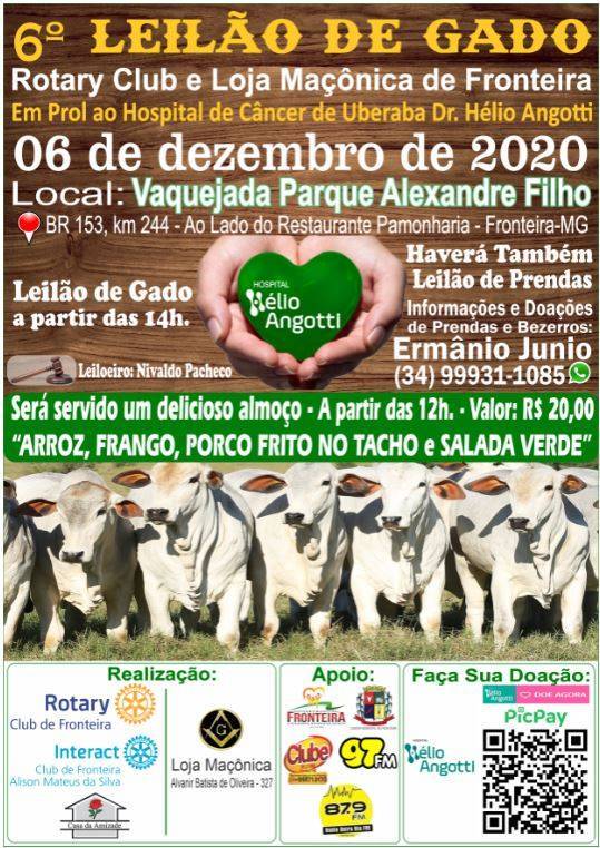 Foi realizado pelo Rotary Club de Fronteira em parceria com a Loja Maçônica Alvanir Batista de Oliveira 327, no dia 06 de dezembro de 2020, em Fronteira no Parque de Vaquejada Alexandre Filho, o 6º Leilão de gado e prendas em Prol ao Hospital do Câncer Dr Hélio Angotti de Uberaba.
