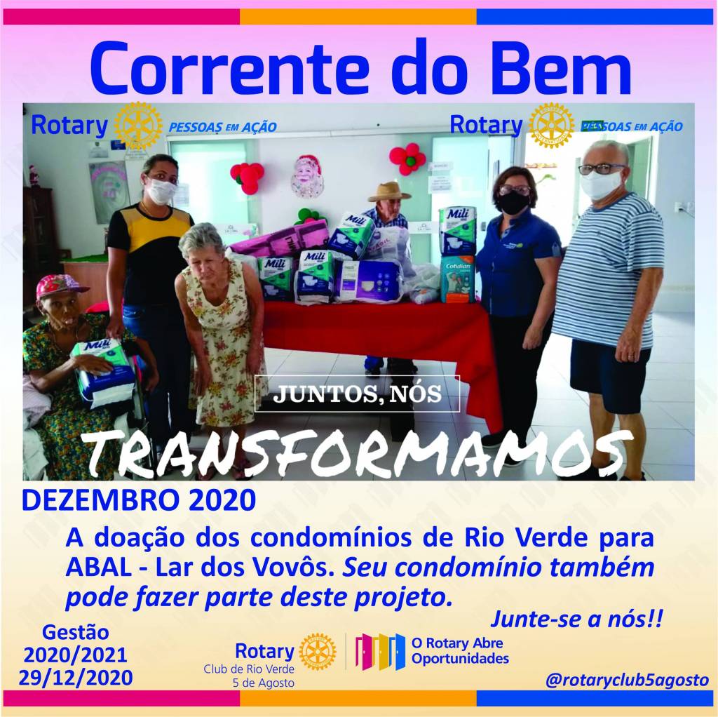 No Mês de Dezembro (29/12/2020), O Rotary Club de Rio Verde 5 de Agosto realizou a 4ª a entrega de alimentos e materiais de higiene do Projeto "Corrente do Bem" na ABAL - Lar dos Vovôs.