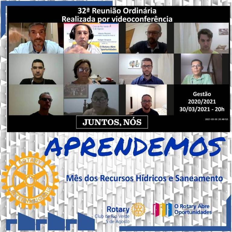 Conforme calendário rotário, o mês de março é dedicado aos Recursos Hídricos e Saneamento, o presidente Roberto Bessa convidou Bruno Saleh, presidente da AMAE- Agência Municipal de água e Esgoto de Rio Verde, Professor od Instituto FEderal Goiano e doutor em Saneamento, para ministra a palestra: "OS DESAFIOS E AVANÇOS NA AREA HÍDRICA E SANEAMENTO DE RIO VERDE".