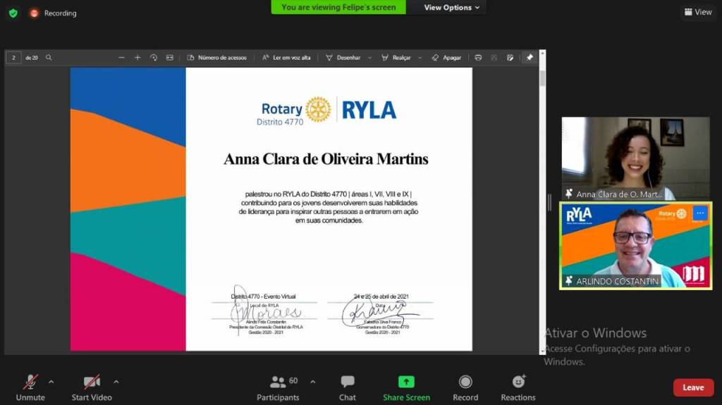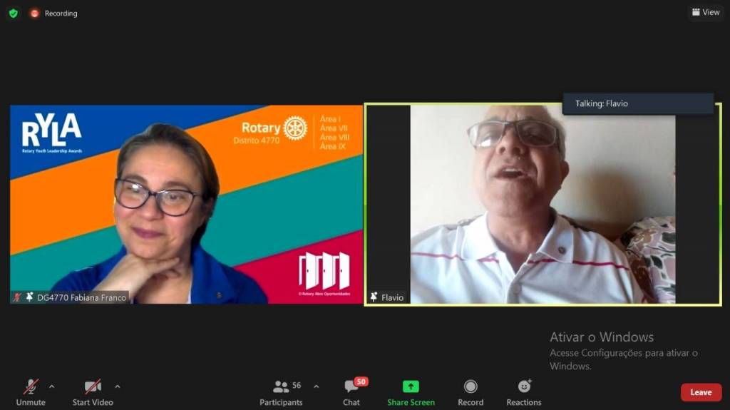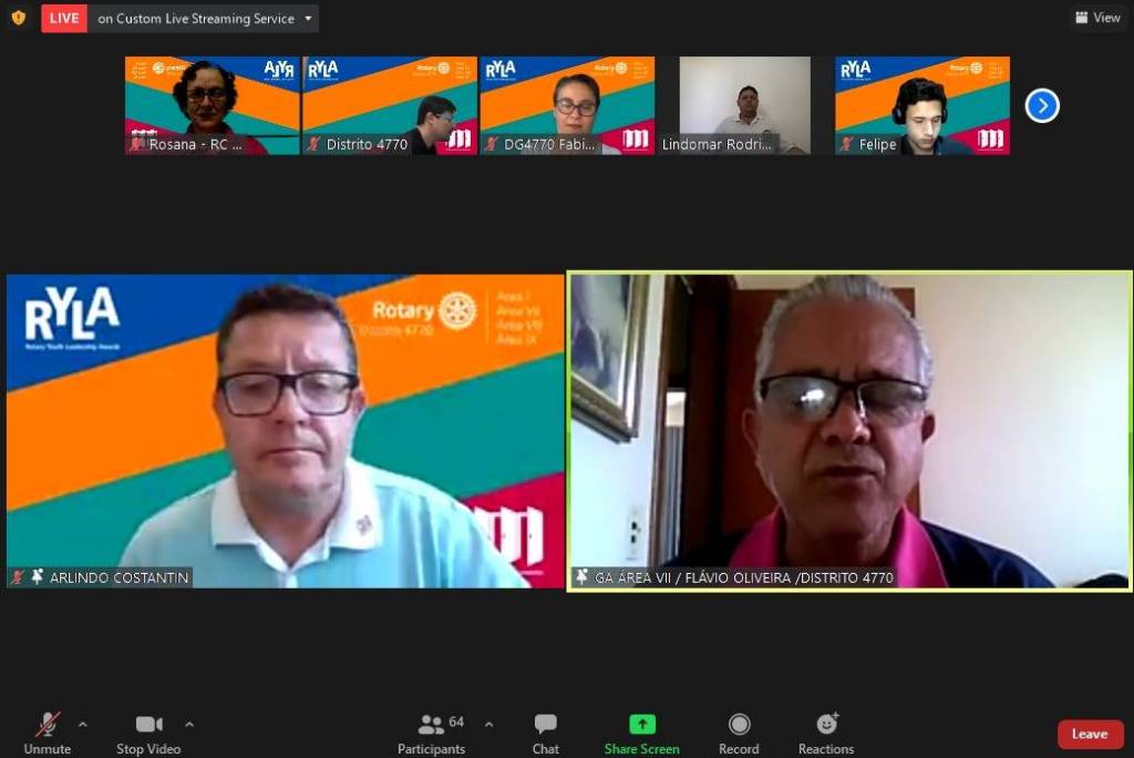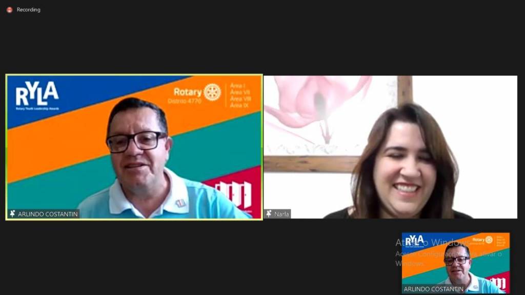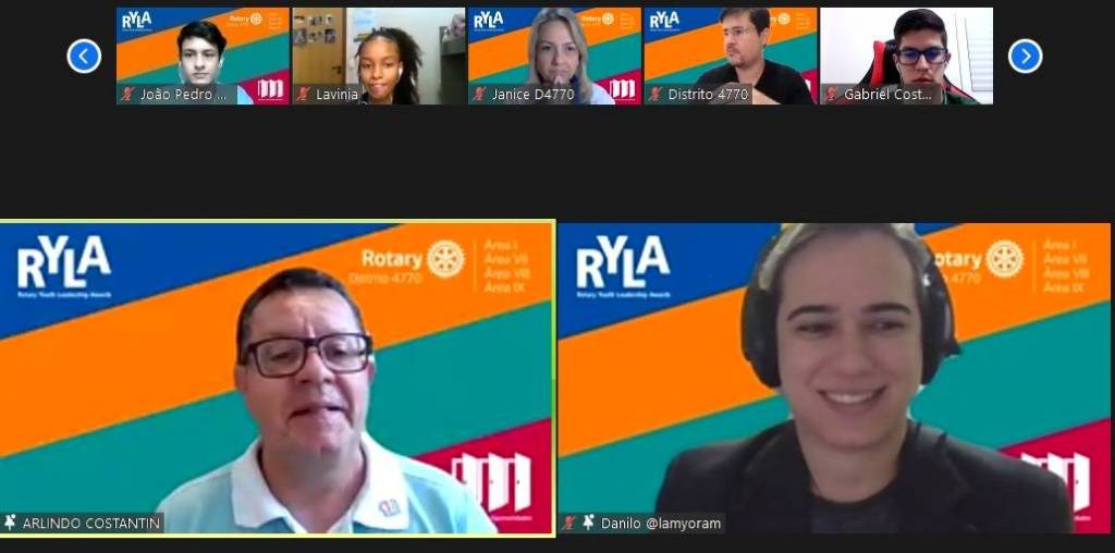 Nos dias 24 e 25 de abril de 2021, Rotary Clubs das Áreas I, VII, VIII e IX se uniram e realizaram, de forma remota, o Seminário RYLA, cuja sigla em inglês significa Prêmios Rotários de Liderança Juvenil, coordenados por Arlindo Felix Costantin e Núbia Alves de Carvalho Ferreira, e pelos GAs das respectivas áreas, Lindomar Rodrigues do Carmo, Flávio Henrique de Lima Oliveira, Solange Azevedo e Manuela Keiko Yano Freitas.