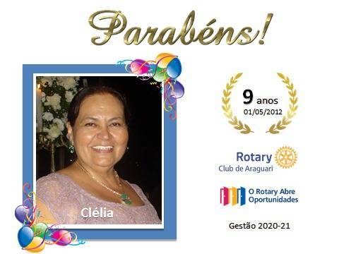 E no dia 1º de maio, celebramos os 09 anos de vida rotária de CLÉLIA ZANETTI, companheira alegre e positiva, amiga e integrante valorosa para a família rotária. Desejamos-lhe muito sucesso na continuidade de sua trajetória junto ao Rotary Club de Araguari.