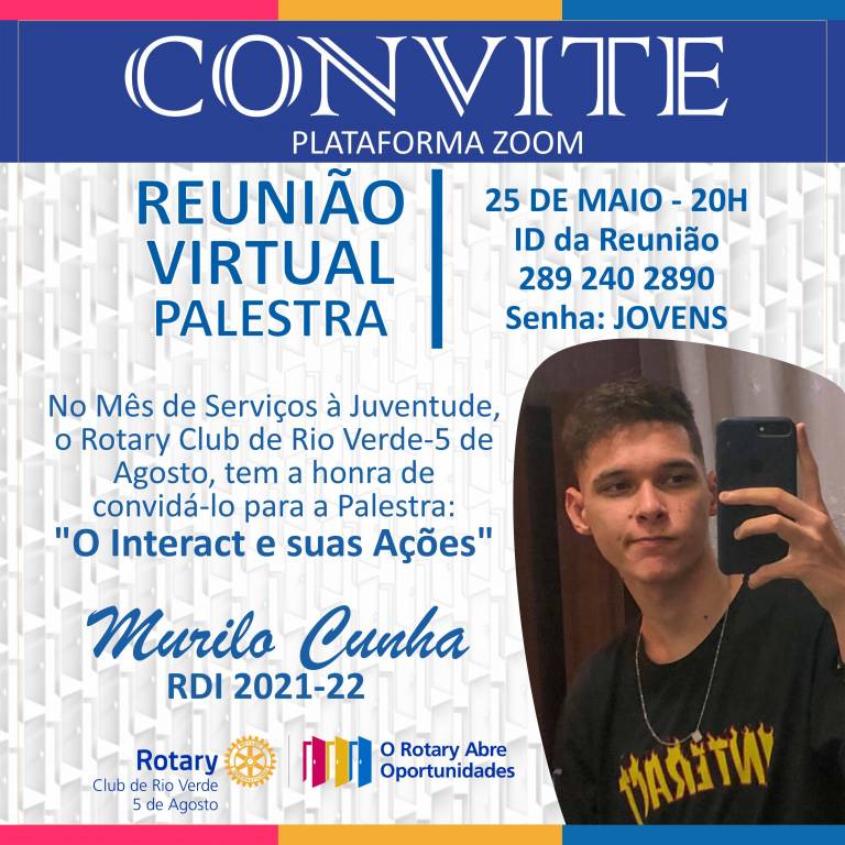 Confirmou a data de 19/06 para a Posse da Nova Diretoria e em seguida convidou o companheiro interactiano : Murilo Cunha - RDI 2021-2022 e associado ao Interact Club de Conquista, para ministrar a palestra: "O INTERACT E SUAS AÇÕES" ,marcando assim o Mês de Serviços à Juventude.