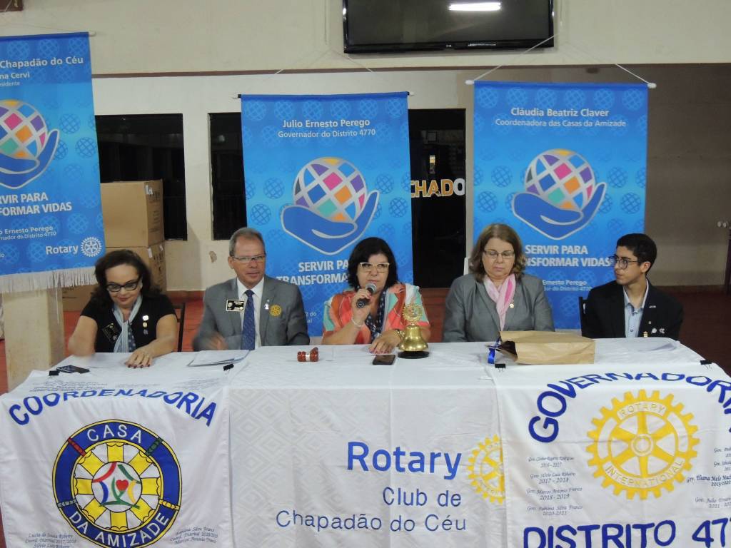 Aconteceu no dia 08 de outubro, a visita oficial do casal Governador do Distrito 4770, Júlio Ernesto Perego e Claudia Beatriz Claver que é Coordenadora das Casas da Amizade. Contamos também com a visita da Governadora assistente Marilene Resende. A visita teve uma extensa agenda de compromissos começando com a reunião na Secretaria de Turismo, onde estiveram presentes a Secretária de Turismo e Cultura Flávia Ficher, a Secretária de Educação Nailde Volk, a vereadora Eunice Ficher, a primeira Dama Margie Peixoto, a fundadora da CAC Associação Cultural, Lucimeire Camargo e rotarianos de Chapadão do Céu. A conversa foi bastante proveitosa com a pauta do Projeto de Redação que o Rotary realizou em agosto e os frutos que irão ser colhidos com a continuação do projeto. Em seguida houveram entrevistas nas rádios da cidade, onde os ouvintes puderam ter a chance de conhecer mais sobre o Rotary e as áreas de atuação desta importante entidade mundial. Na parte da tarde, houve a reunião com o Prefeito em exercício, Vinícius Terin, que recebeu nossa comitiva com bastante entusiasmo e ouviu nossas propostas para a comunidade céu chapadense com muita atenção, abrindo as portas da Prefeitura Municipal para parcerias que irão beneficiar nossa cidade. O casal plantou uma árvore símbolo do cerrado, um ipê, que com certeza fará parte da história desta cidade. Na parte da noite foram realizadas as reuniões com o Ineract, que contou com a participação do Presidente Adriano Diogo Júnior e Pedro Pais Lima, com muita informação e comprometimento para esta gestão. Logo em seguida iniciou-se a reunião com os integrantes do Rotary Clube de Chapadão do Céu. Obtivemos muitas informações importantes e compartilhamos nossas dúvidas e ansiedades com relação aos projetos futuros. Encerramos a noite com a reunião festiva e um jantar maravilhoso que aconteceu no Clube do Céu. Agradecemos a presença do casal Governador Júlio e Claudia, da nossa grande companheira Marilene e de todos os rotarianos que se comprometeram com o dia tão importante para nosso clube!