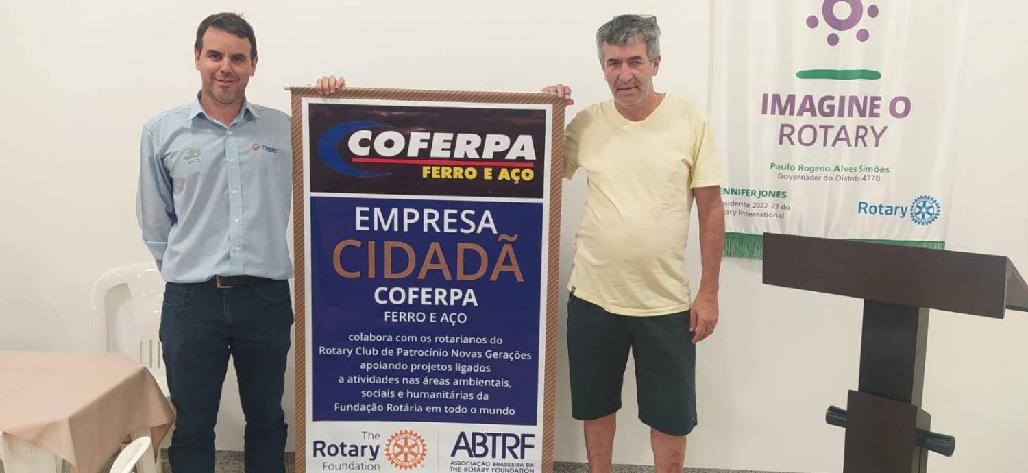 Empresa Cidadã é um programa de contribuições através de compromisso contratual, firmado entre a uma Empresa/Pessoa Jurídica e um Rotary Club ou Distrito Rotário, para realizar 12 contribuições mensais no valor mínimo de R$300 (trezentos reais) ou contribuir de uma única vez com o valor correspondente a 1.000 dólares rotários. Através da ABTRF, essas contribuições são todas destinadas aos projetos humanitários da Fundação Rotária no Brasil, com o oferecimento de divulgação da marca ou mensagens publicitárias da empresa, conforme definido em Norma. No mês de novembro , a empresa COFERPA Ferro e Aço, representada por um dos sócios, Sr. Cássio Gontijo Brandão, firmou uma parceria com o Rotary Club de Patrocínio Novas Gerações e com o distrito 4770. Agradecemos imensamente a empresa pela confiança e apoio nas causas rotarias. Que possamos, cada vez mais, servir ao próximo , trabalhando e acreditando sempre em dias melhores!