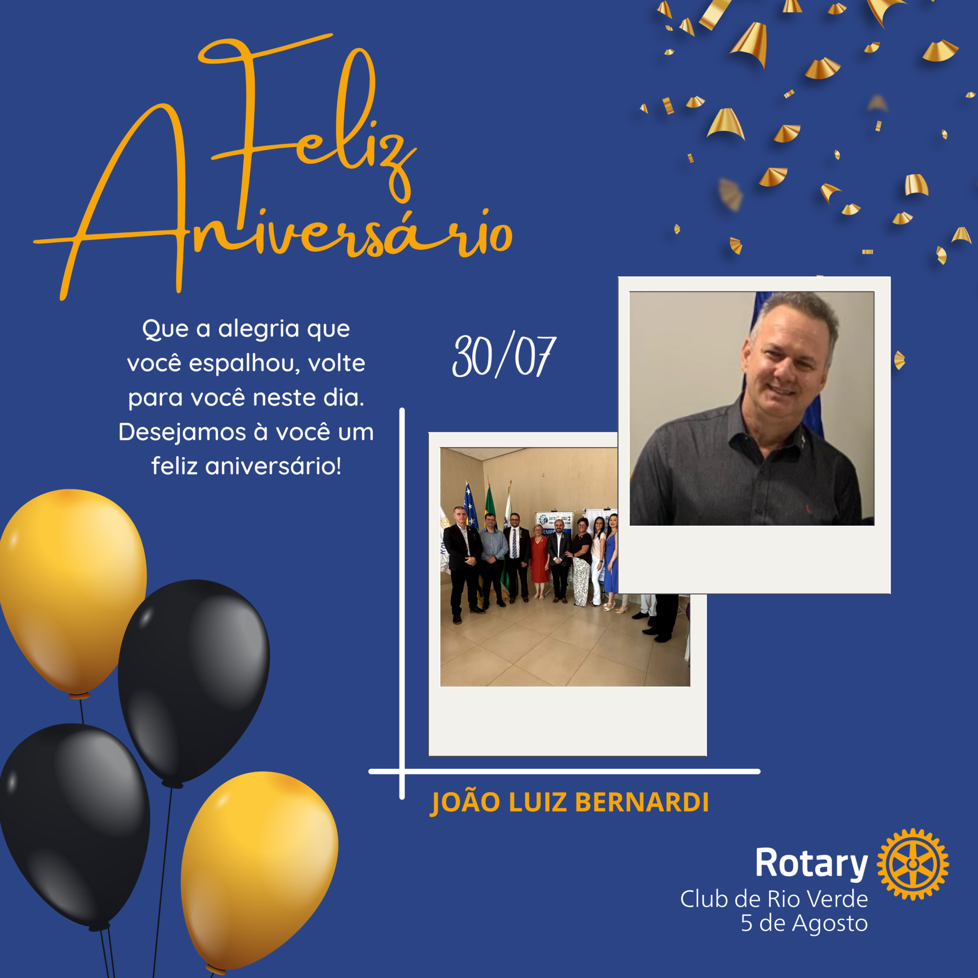 Companheiro João Luiz, todos os associados do Rotary Club de Rio Verde 5 de Agosto o cumprimentam pelo seu aniversário, desejando-lhe muita saúde, alegrias, e as bençãos de Deus em sua vida.