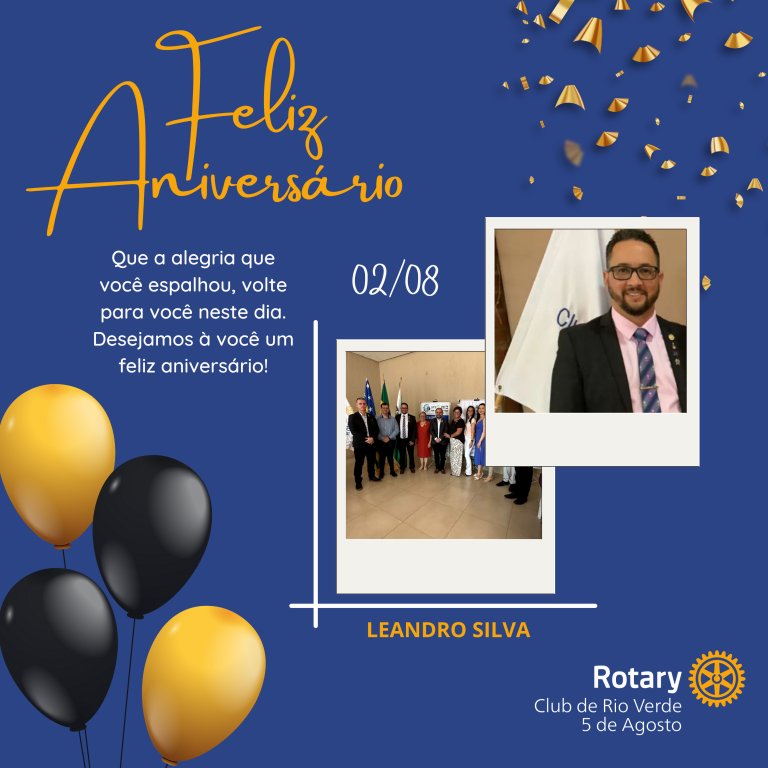 Companheiro Leandro Silva, todos os associados do Rotary Club de Rio Verde 5 de Agosto o cumprimentam pelo seu aniversário, desejando-lhe muita saúde, alegrias, e as bençãos de Deus em sua vida.