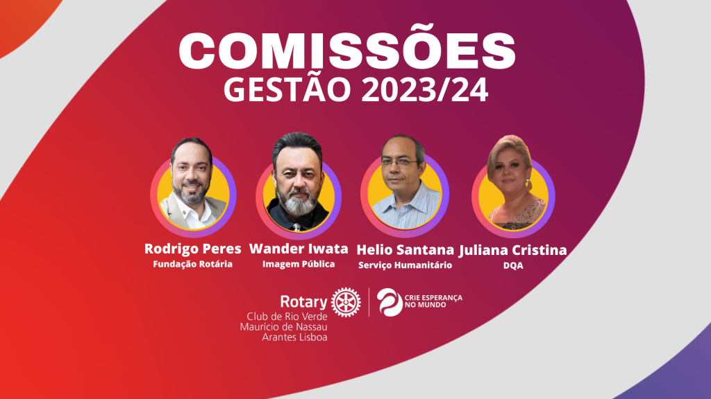 Apresento a todos o Conselho Diretor e Comissões Gestão 2023-24, com o lema "CRIE ESPERANÇA NO MUNDO". Acredito que esse lema reflita nosso propósito como rotarianos e a capacidade que temos de fazer a diferença na vida das pessoas e nas comunidades que servimos. Ao criar esperança, podemos transformar vidas e contribuir para um mundo melhor.