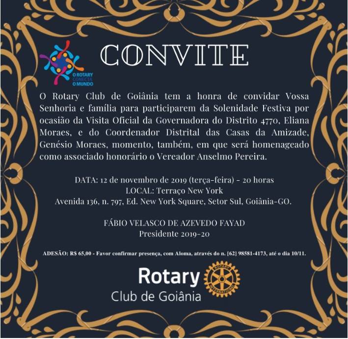 O Rotary Club de Goiânia tem a honra de convidar Vossa Senhoria e família para participarem da Solenidade Festiva por ocasião da Visita Oficial da Governadora do Distrito 4770, Eliana Moraes, e do Coordenador Distrital das Casas da Amizade, Genésio Moraes, a se realizar no dia 12 de novembro de 2019, às 20 horas, no Terraço New York.