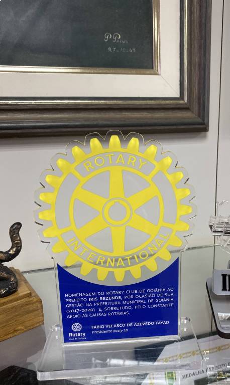 O prefeito Iris, ao receber homenagem do Rotary Club de Goiânia, imediatamente o colocou em posição de destaque na sua sala de trabalho, demonstrando alegria por poder compartilhar com todos este momento especial.