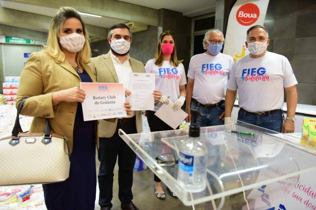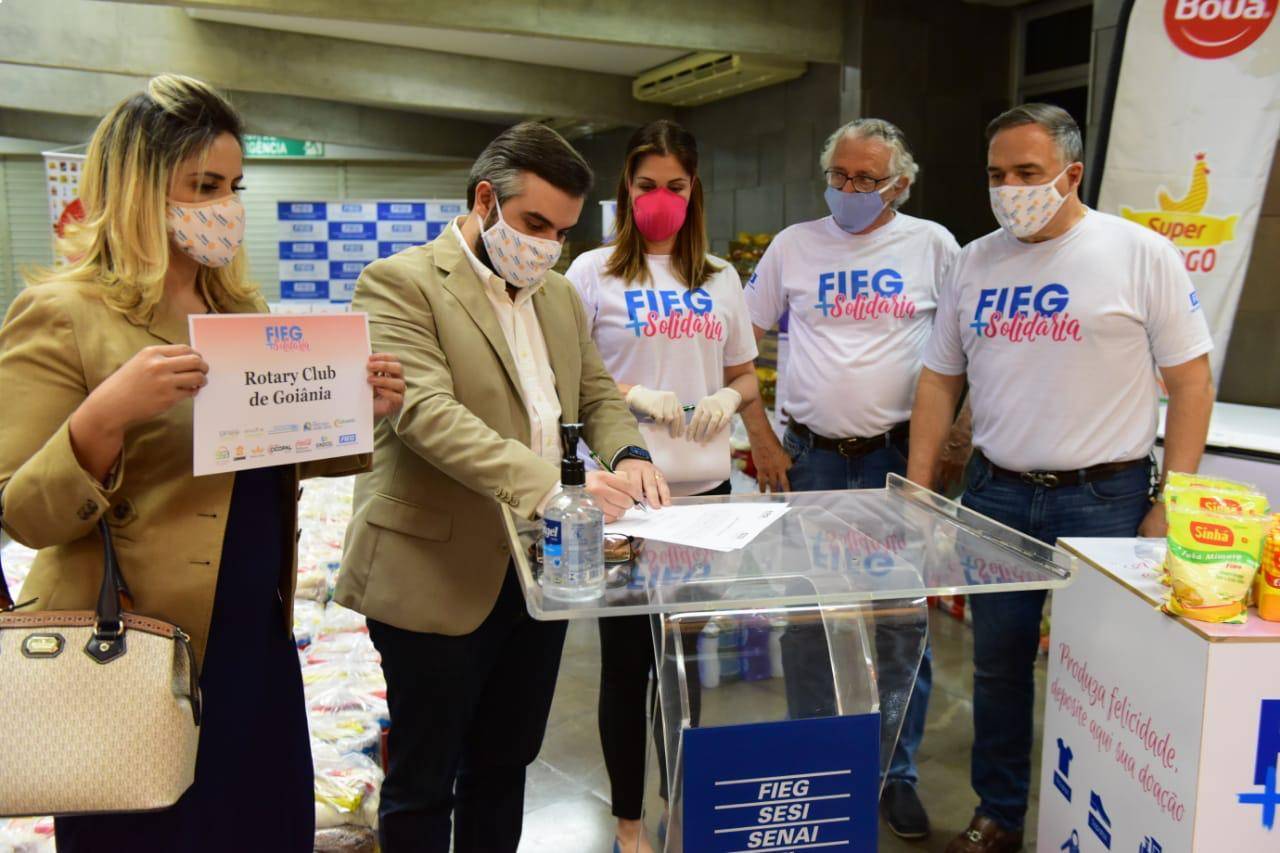O presidente do Rotary Club de Goiânia, Fábio Fayad, recebeu do presidente da Federação das Indústrias do Estado de Goiás (FIEG), o rotariano Sandro Mabel, e de sua esposa Raquel Ribeiro, a doação de mais de meia tonelada de alimentos que serão destinados para os trabalhos sociais desenvolvidos pela instituição, fundada em Goiânia no ano de 1941.