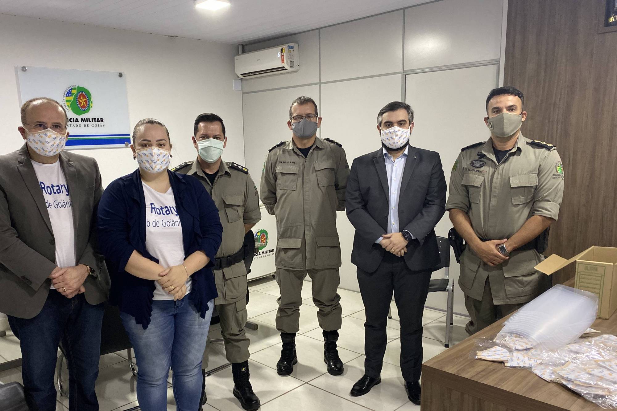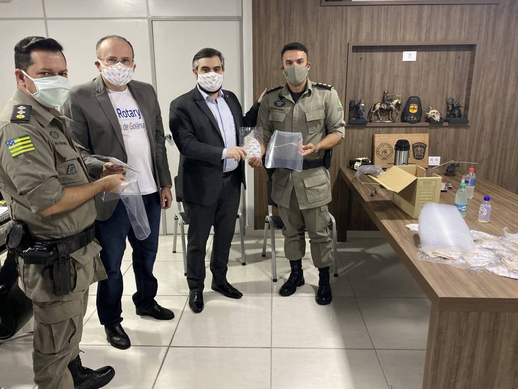 Tendo em vista o crescimento exponencial do número de policiais contaminados pelo novo coronavírus, eis que integrantes do grupo de profissionais de “linha de frente”, que estão expostos diariamente ao vírus, o Rotary Club de Goiânia, por meio da campanha “Todos contra o COVID-19”, esteve na sede do Comando de Gestão e Finanças da PMGO, para realizar doação de Equipamentos de Proteção Individual (EPI´s), com destaque para as máscaras reutilizáveis e protetores faciais.
