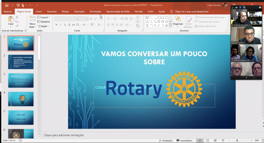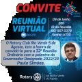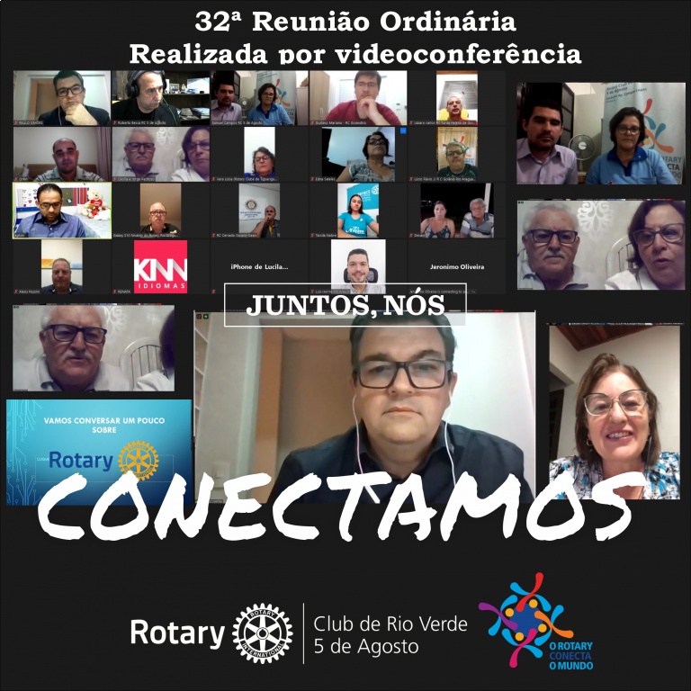 No dia 09/06/2020 o Rotary Club Rio Verde 5 de Agosto realizou sua 32 Reunião Ordinária por videoconferência. Tivemos como pauta a Palestra do Governador Designado 2022/23 Paulo Simões proferindo a Palestra: "vamos conversar um pouco sobre Rotary". Agradecemos a presença da Governadora Eliana Moraes, o Casal GA Omar e Nília, o GA 2020/21 Alexis Pezzini, os companheiros do RC Santa Helena Edna Sateles e Lazaro Carlos, o Companheiro Gean Nobre do RC de Rio Verde Cerrado Goiano, a nossa RDI 2020/21 Tarsila Nobre, o Companheiro Jeronimo Oliveira do RC de Rio Verde, o companheiro do RC Goiandira Gustavo Mariano, os companheiros do RC Goiania Rio Araguaia Lúcio Flávio e Nivaldo e a companheira RC de Tupaciguara Vera Lúcia. Convidamos para nossas futuras reuniões virtuais, às terças-feiras às 20h através o Zoom.
