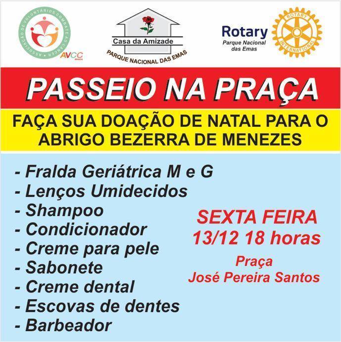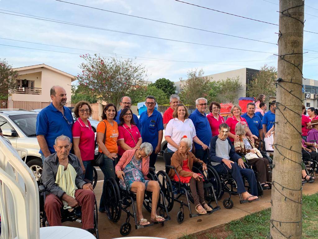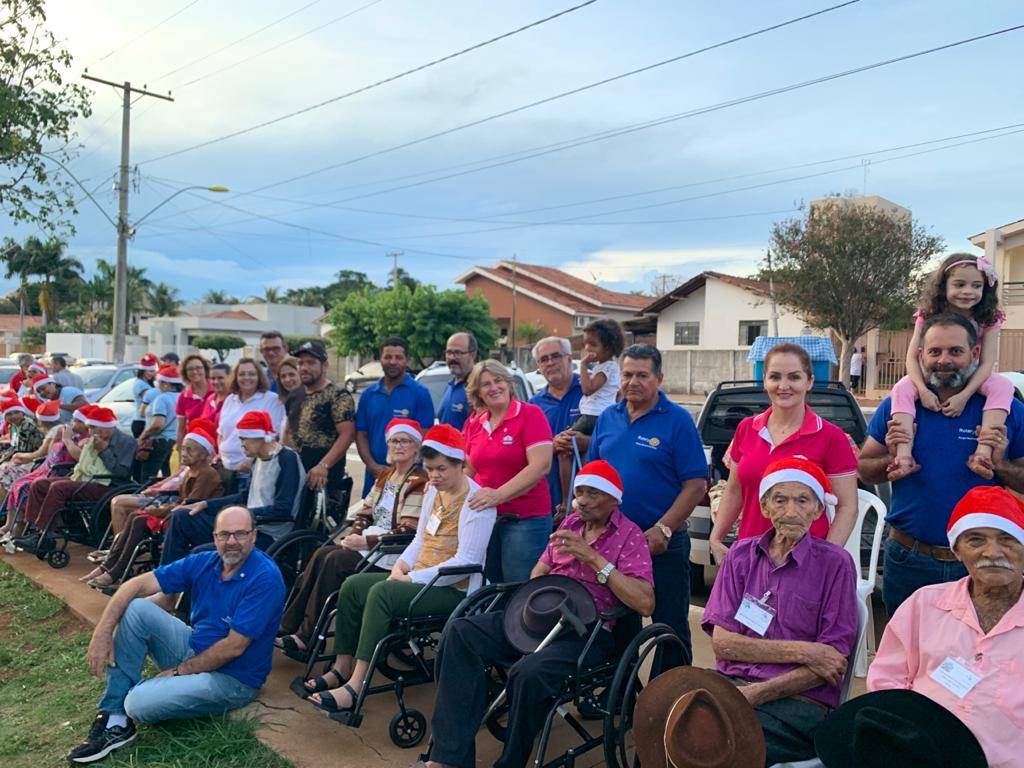 No dia 13 de Dezembro de 2019 aconteceu um passeio com os Idosos do Lar Bezerra de Menezes. A ação foi uma parceria firmada entre nosso clube, Casa da Amizade Parque Nacional das Emas e AVCC Mineiros. O objetivo foi proporcionar um passeio para os idosos nessa época natalida, retirando os mesmos das dependências do Lar. A Karyna Tour e a AVCC forneceram dois ônibus para o transporte dos Idosos, e os nossos associados juntamente com os cuidadores, tomaram todas as medidas de segurança para esse momento com os mesmos. Além do passeio, várias pessoas da comunidade levaram doações para a praça destinadas aos idosos, como fraldas geriátricas, e diversos materiais de higiene pessoal. Na ocasião, nosso clube fez a doação de 20 Cadeiras de Rodas, que foram usadas no transporte e posteriormente ficaram nas dependências do Lar para atender as necessidades. Mais de 30 idosos foram beneficiados com o passeio e as doações.