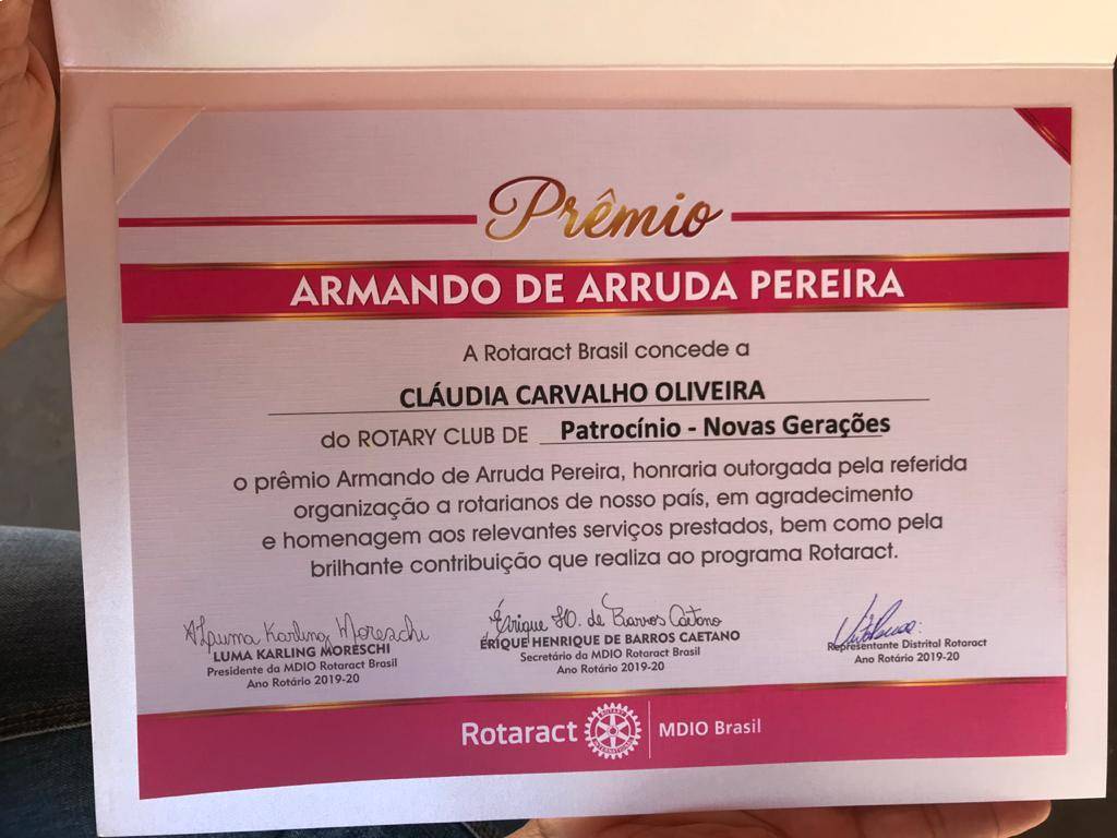 - No dia 20 de Junho de 2020, as 13h aconteceu na cidade de Patrocinio a Conferencia Distrital De Rotaract Clubs (CODIRC), e na oportunidade a companheira Claudia Carvalho De Oliveira recebeu das mãos do representante distrital do Rotaract Victor Matias De Melo Pessoa o prêmio Armando de Arruda Pereira, que é a maior honraria atribuída a rotarianos que ajudam o Rotaract.