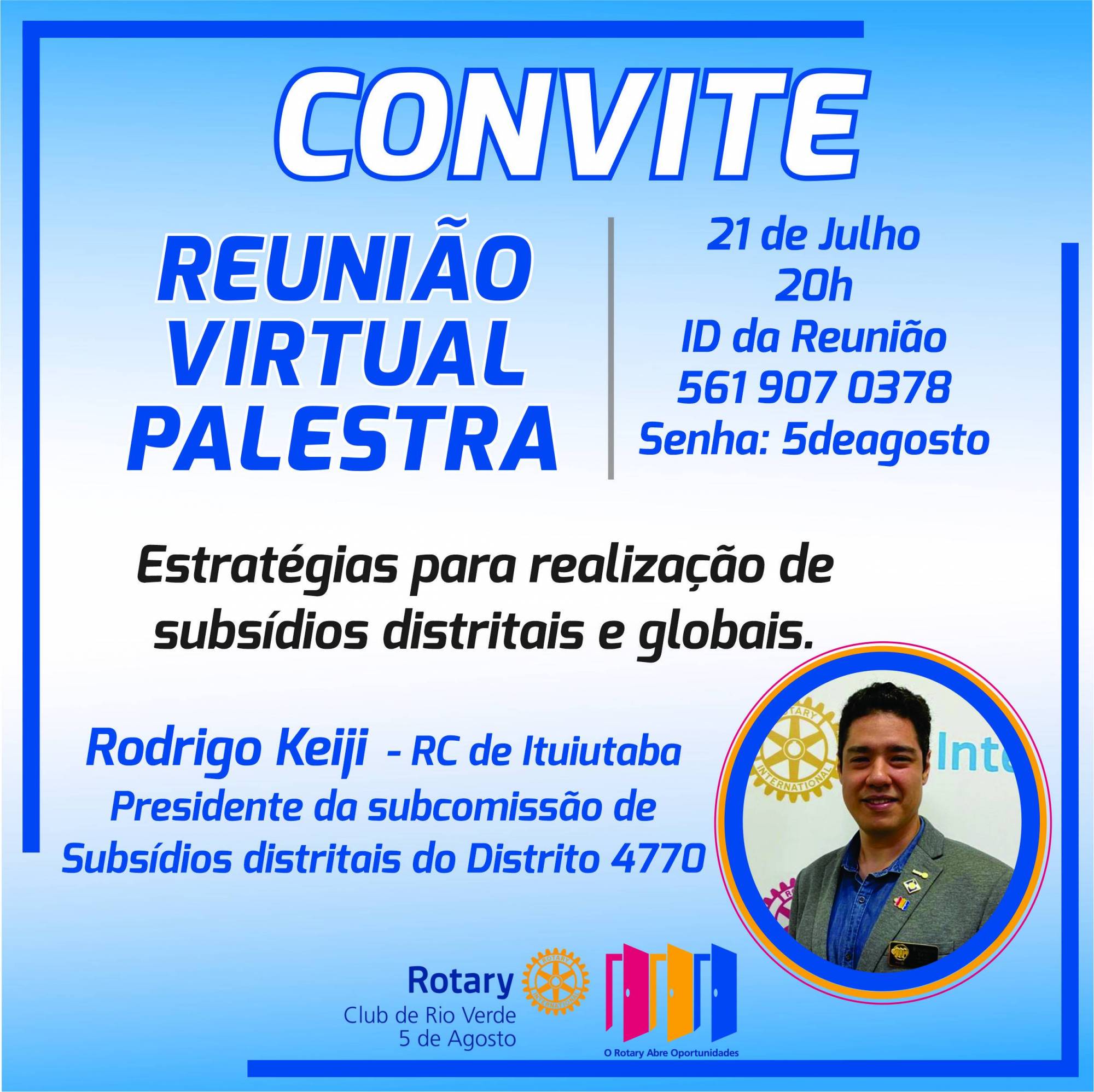 No dia 21/0/2020 o Rotary Club Rio Verde 5 de Agosto promove a Palestra: Estratégias para realização de subsídios distritais e globais com Rodrigo Keiji Presidente da Subcomissão de Subsídios Distritais do Distrito 4770. Convidamos todos companheiros para nossa reunião virtual através o Zoom.