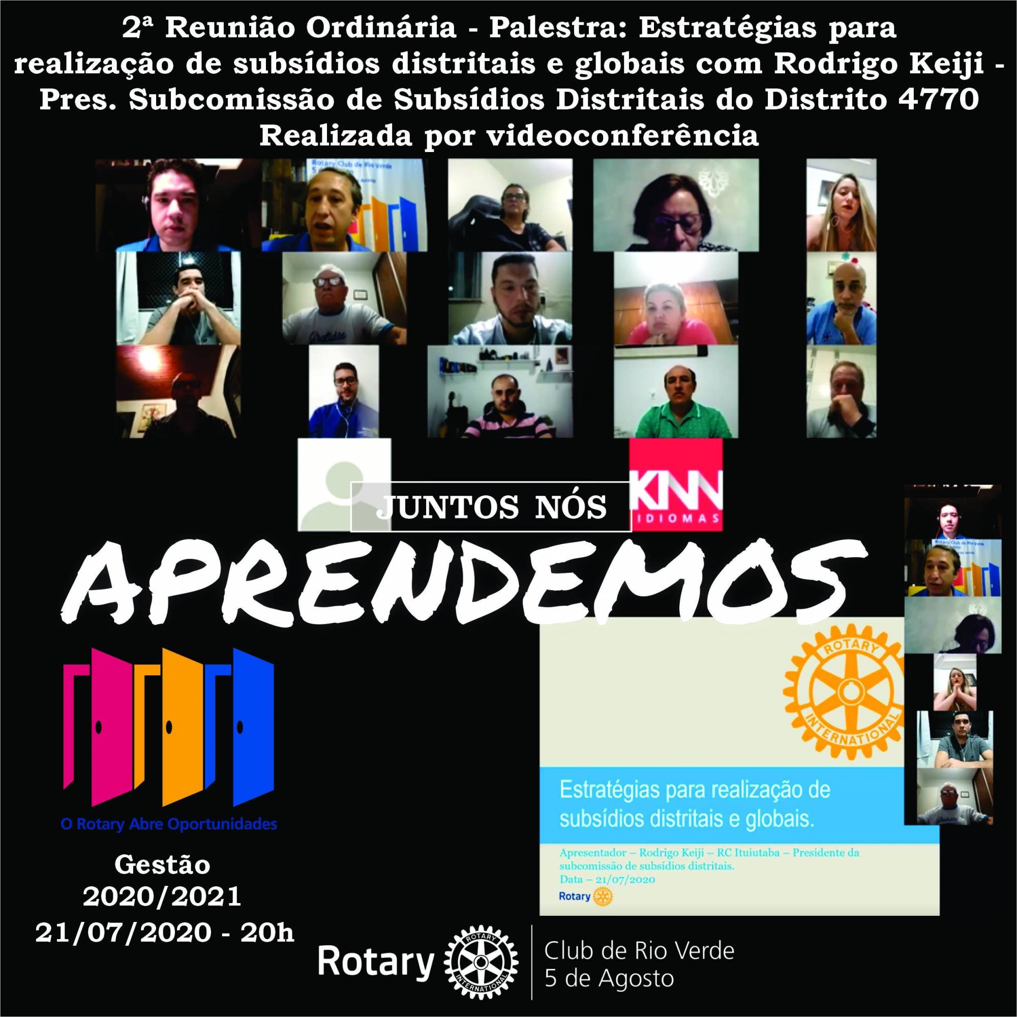 No dia 21/07/2020 o Rotary Club Rio Verde 5 de Agosto realizou sua 2ª Reunião Ordinária por videoconferência. Tivemos como pauta 1) Projeto Corrrente do Bem