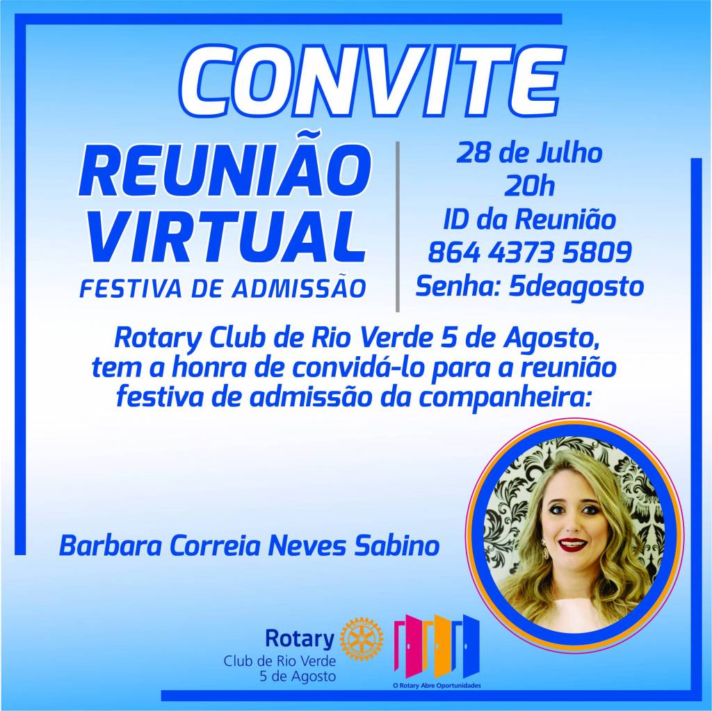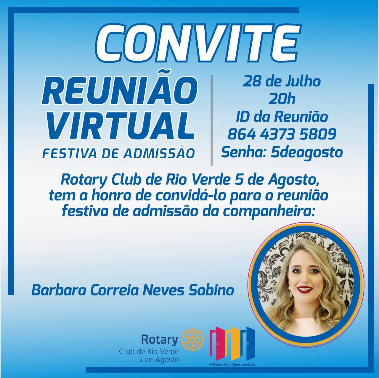 O Rotary Club de Rio Verde 5 de Agosto tem a honra de convidá-lo a participar da festiva de admissão da companheira Barbara Correia Neves Sabino. No dia 28/07/2020 às 20h, pela Plataforma Zoom ID: 864 4373 5809 Senha 5deagosto