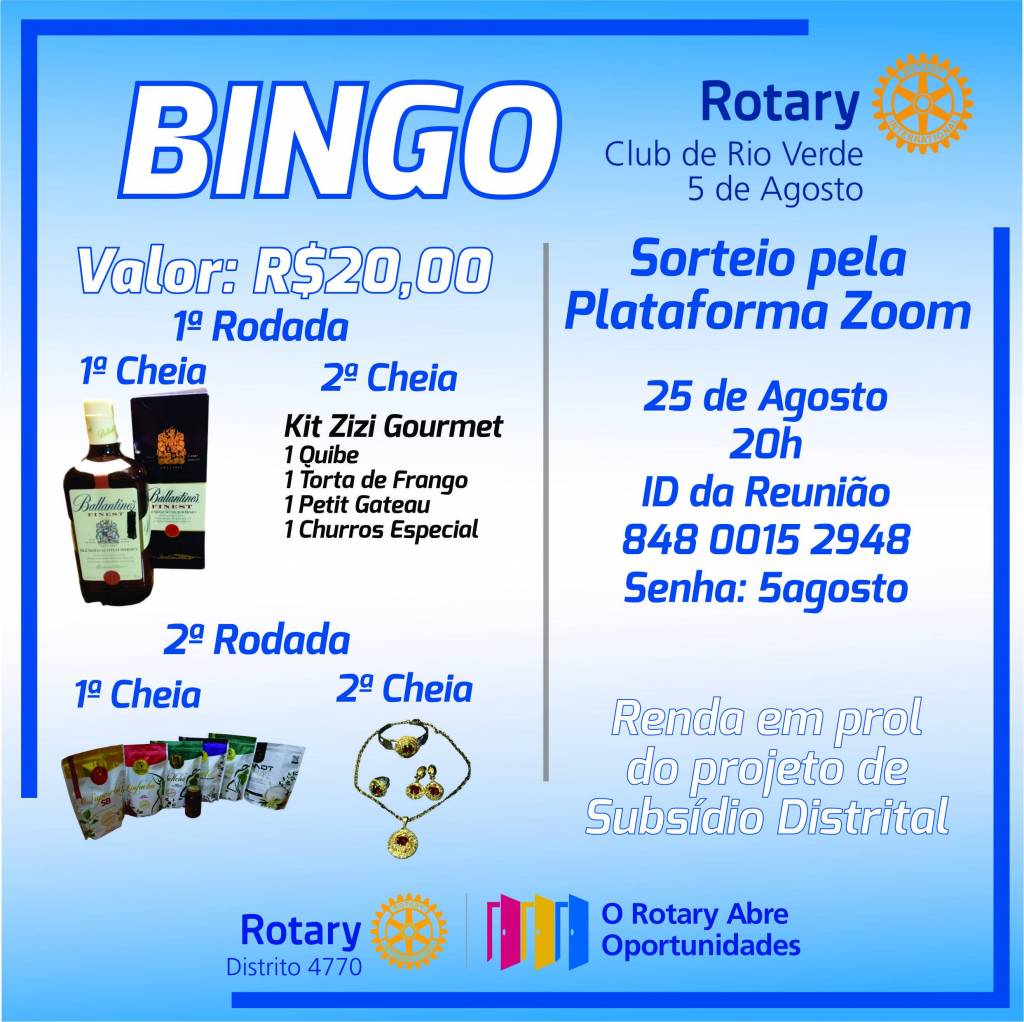 No dia 25/08/2020, às 20h, o Rotary Club de Rio Verde 5 de Agosto promoverá BINGO em prol dos Projetos de Subsídios Distritais. Adquiria seu Bingo com os companheiros do Rotary Club 5 de Agosto.