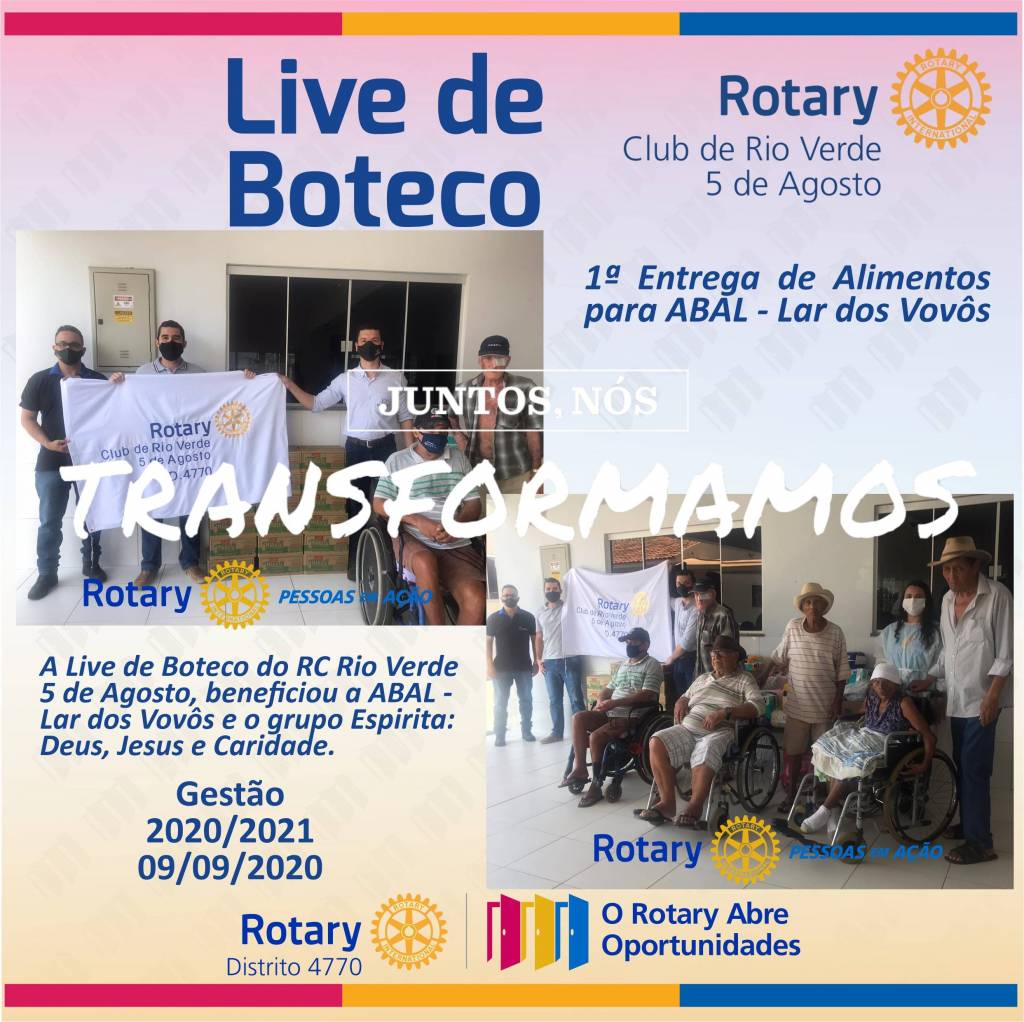 O Rotary Club de Rio Verde 5 de Agosto entregou no dia 09/09/2020 alimentos arrecadados na "Live de Boteco" para a ABAL- Lar dos Vovôs.