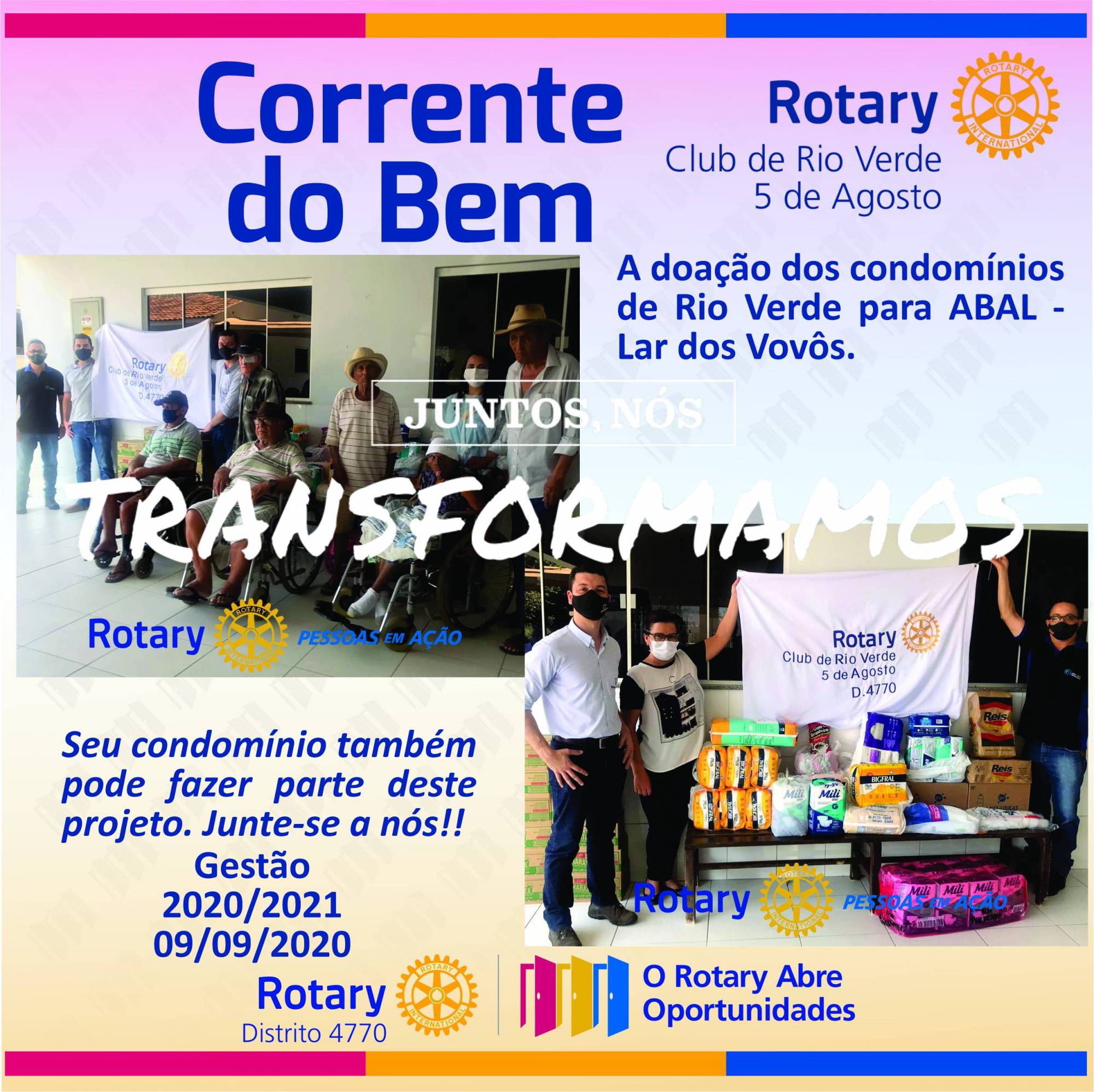 O Rotary Club de Rio Verde 5 de Agosto realizou no dia 09/09/2020 a 1ª entrega de alimentos e materiais de higiene do Projeto "Corrente do Bem" na ABAL - Lar dos Vovôs.