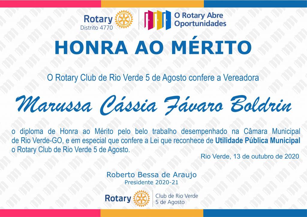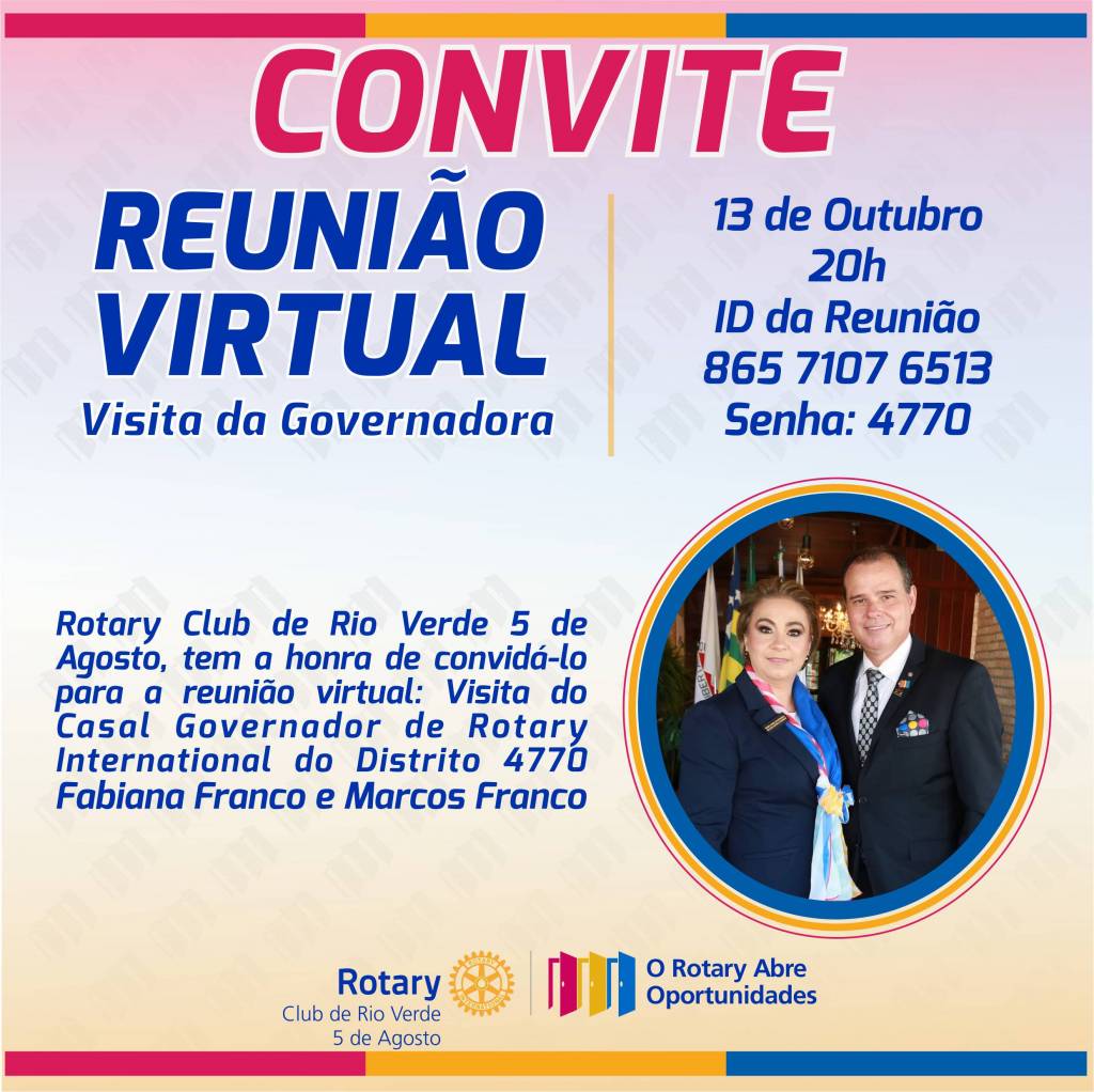 O Rotary Club de Rio Verde 5 de Agosto recebeu no dia 13/10/2020 a visita oficial da Governadora Fabiana Franco. Fizemos um breve relato destes primeiros meses de gestão, também apresentamos nosso planejamento das ações até final da Gestão, na Reunião recebemos a Lei Municipal 7105/2020 que Reconhece Utilidade Pública do Rotary Club de Rio Verde 5 de Agosto das mãos da Vereadora Marussa Boldrin. Tivemos a participação dos visitantes: Governador Assistente Alexis Pezzini, Presidente do RC de Rio Verde Jeronimo Oliveira Sousa, RDI Tarsila Nobre, da Vereadora Marussa Boldrin e do companheiro do RC de Rio Verde Ricardo Vieira de Carvalho Neto.
