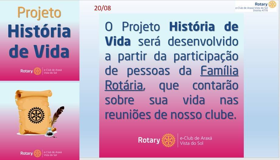 Está sendo desenvolvido através da participação de pessoas da Família Rotária, que contarão sobre sua vida nas reuniões do clube a Primeira foi a Fundadora e sócia honorária do e-clube: Antônia Auxiliadora Rios (Dorinha) que contou sua história de vida, mostrando quantos desafios uma mulher do campo de personalidade forte, destemida, enfrentou para estudar e crescer profissionalmente, uma mulher a frente do seu tempo, sua história inspirou a todos presentes na reunião, após ela indicou a próxima a contar a história que foi a associada primeira presidente do e-club Sharon Sampaio Caetano, que contou sua história de amor e dedicação a enfermagem sua profissão e ao Rotary e emocionou a todos. A mesma indicou a associada Fabiana de Oliveira para compartilhar sua história de vida na próxima reunião.