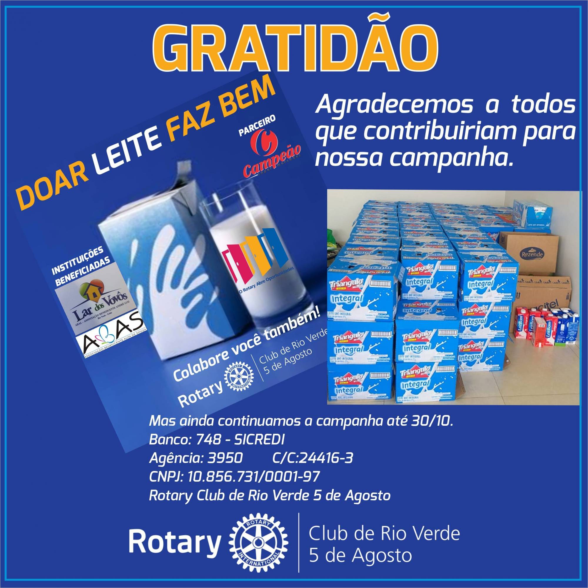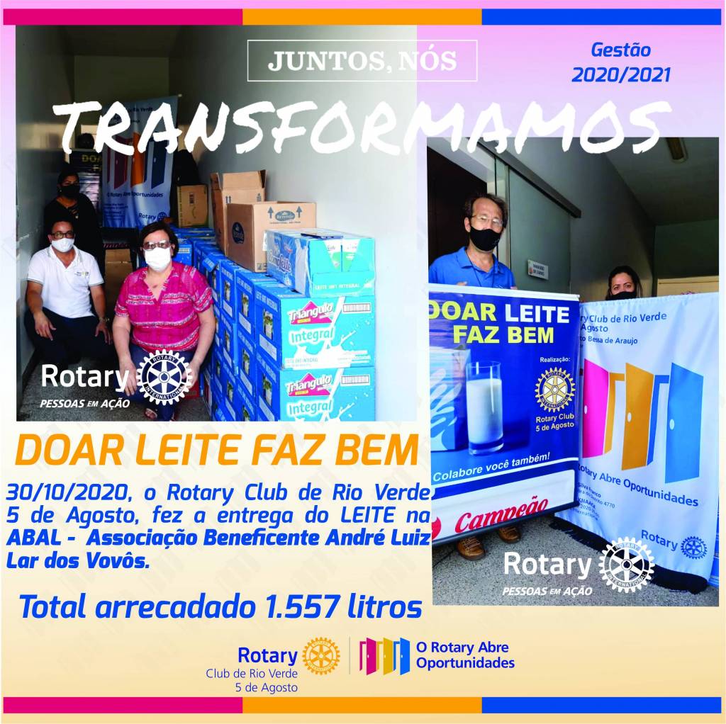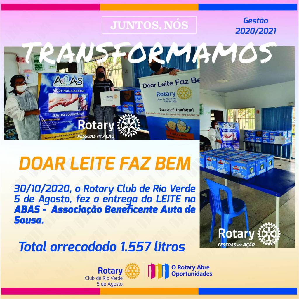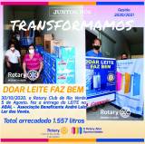 O Rotary Club de Rio Verde 5 de Agosto, entregou na tarde do dia 30/10/2020, 1.557 litros de Leite arrecadado da Campanha "Doar Leite Faz Bem", para as instituições ABAS - Associação Beneficente Auta de Sousa e ABAL - Associação Beneficente André Luiz Lar dos Vovôs. Agradecemos todos companheiros do Rotary Club de Rio Verde 5 de Agosto e também agradecemos a todas doadores que abraçou a nossa campanha e fez acontecer com SUCESSO. Como diz os dois slogans do Rotary: "Mais Se Beneficia Quem Melhor Serve e Dar de Si Antes de Pensar em Si", com este sentimento finalizamos nossa campanha. Gratidão e Muito Obrigado!